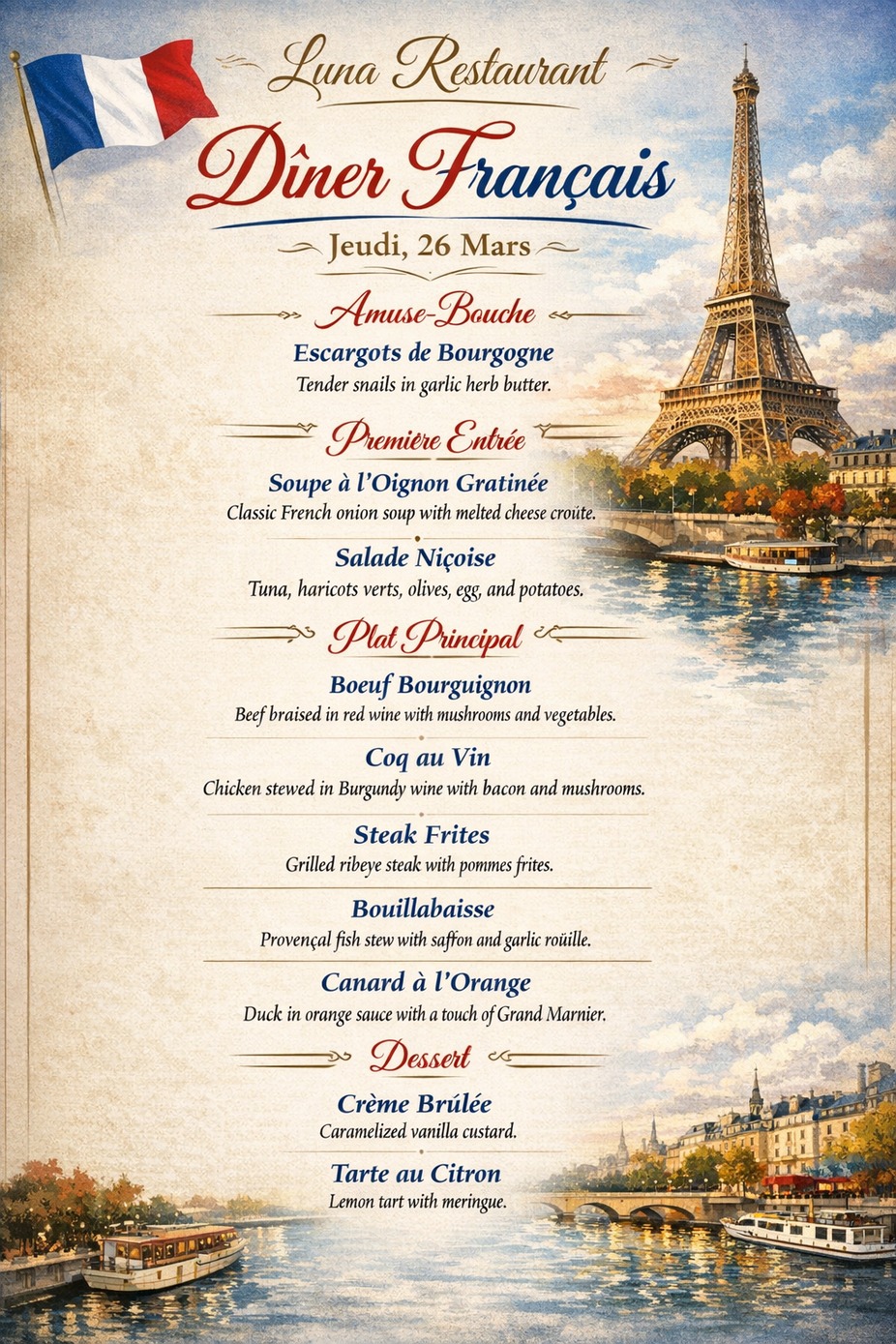 Join us for a special Dîner Français at Luna, an evening inspired by the timeless flavors of France.